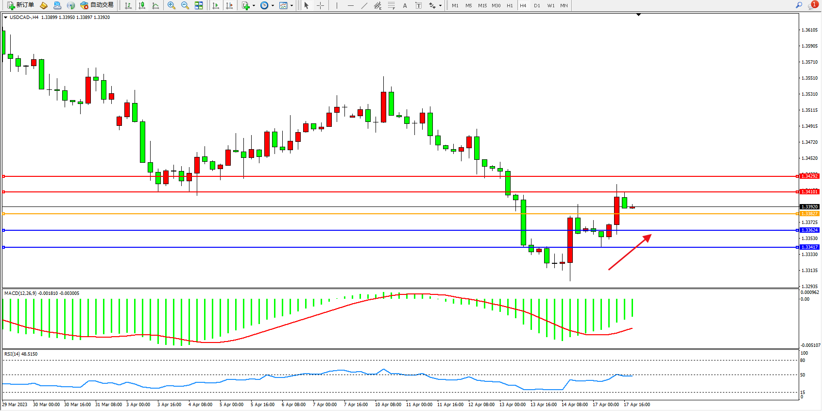 美元加元USDCAD——4小时K线图显示: