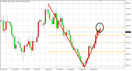 周四(8月31日)周四美联储青睐的核心PCE物价指数如期温和增长,但经通胀调整的个人消费支出环比超预期增长,美元指数反弹,美债收益率飙升,现货黄金止步三日连涨,收盘失守1940美元关口,收跌0.13%。