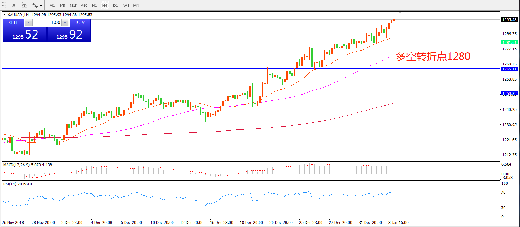 交易策略:在1280.00之上看涨,目标1300.00  1319.00